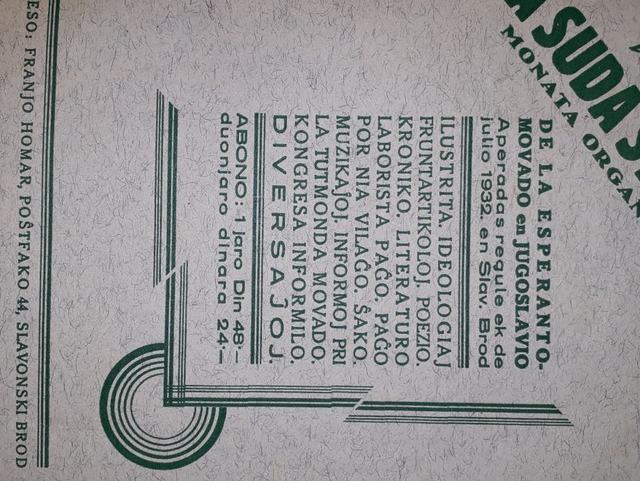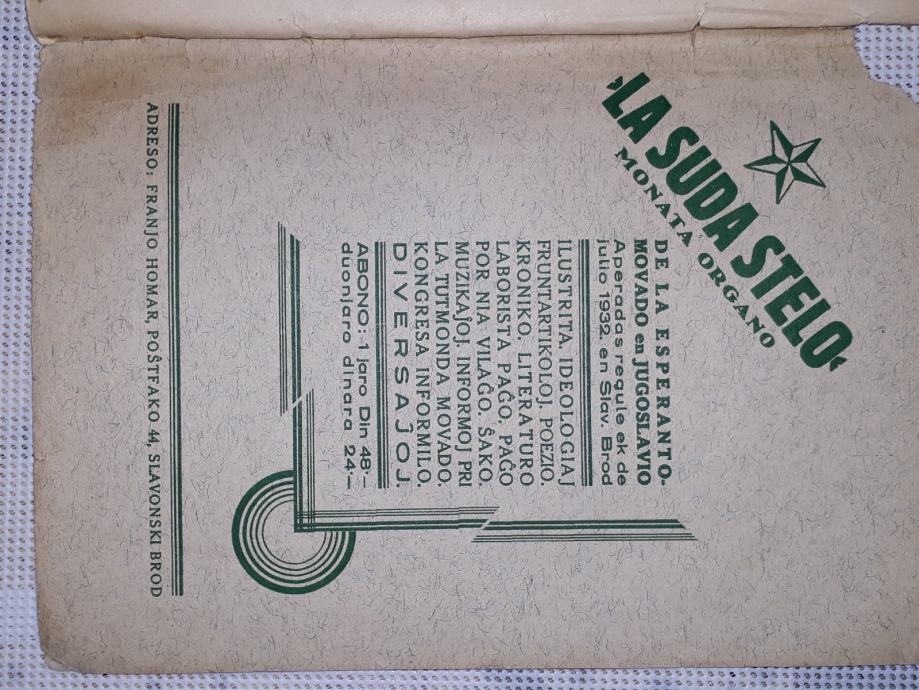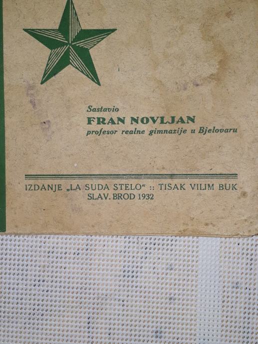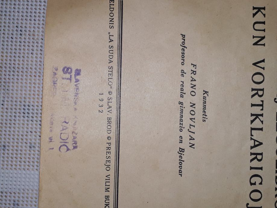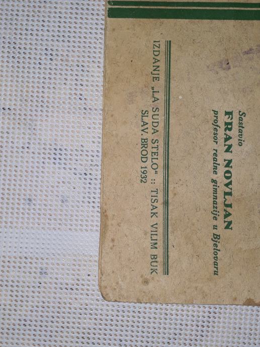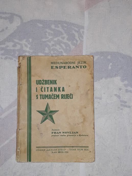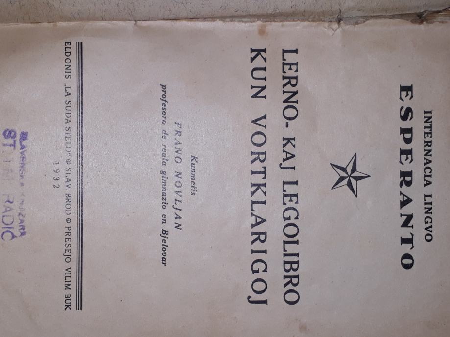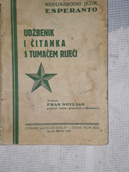 1927 g. uđbenik za esperanto-sastavio Fran Novljan profesor realne gimnazije u Bjelovaru. Izdanje La Suda Stelo.tisak Vilim Buk Slavonski Brod .stanje vidljivo