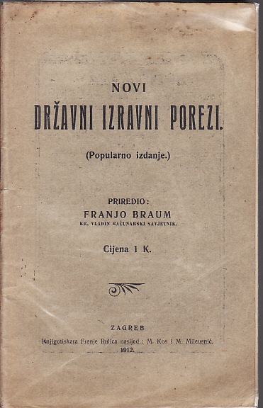 FRANJO BRAUM : NOVI DRŽAVNI IZRAVNI POREZI , ZAGREB 1912.