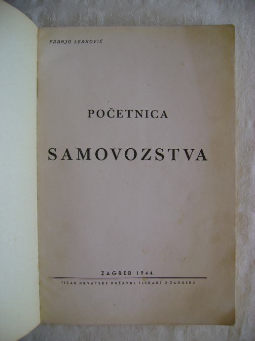 Franjo Leaković - Početnica samovozstva; Priručnik za samovoznu službu, 1. dio - izdavač Ministarstvo oružanih snaga, Glavnostožerni ured, Zagreb 1944. godine, 14 x 20 cm, meki uvez i papirnati omot, 87 stranica, bogato ilustrirano crtežima, tiskala Hrvatska državna tiskara.