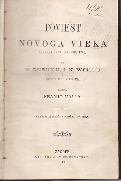 FRANJO VALLA : POVIEST NOVOGA VIEKA od 1453. do 1789. god.