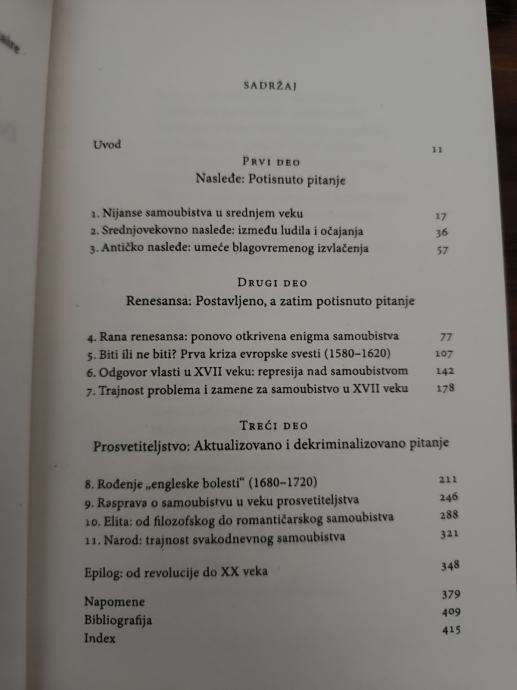 Od najstarijeg antičkog doba do danas, muškarci i žene su odabirali smrt. Ovaj izbor nikada nije ostavljao ljude ravnodušnim. Mada je u retkim prilikama pozdravljan kao herojski čin, najčešće je bio predmet društvene osude. Stvar je u tome što se samoubistvo istovremeno smatra uvredom Boga, koji nam je dao život, i društva, koje se stara za dobrobit svojih žitelja. Odbaciti taj Božji dar i odbaciti društvo bližnjih na banketu života dve su greške koje verski čelnici, koji se bave božanskim poslovima, i politički čelnici, koji organizuju narečeni banket, ne mogu da tolerišu. Biti ili ne biti: nije to pitanje, kažu oni. Ako postojimo, znači da moramo postojati kako bismo slavili Boga i bili korisni društvu. Oni koji pobegnu bivaju strogo kažnjeni, u onostranom s jedne strane, i preko svog leša s druge. Takav nepodeljeni i nesporan stav vlada u Evropi do kraja srednjeg veka. Počinje da se menja u ranoj renesansi, krajem XV veka, kada je, pomoću ludila i pomalo šaljivim tonom, prvi put osporen. Onda se osporavanje javljalo sve češće, sve dok nije 1600. godine izbacilo to pitanje u prvi plan i napravilo prostor za sve oštriju raspravu tokom krize evropske svesti, te postalo otvoreni izazov u doba prosvetiteljstva.