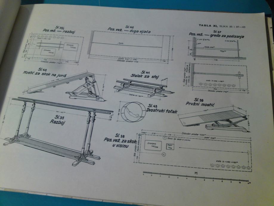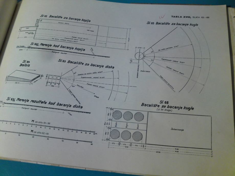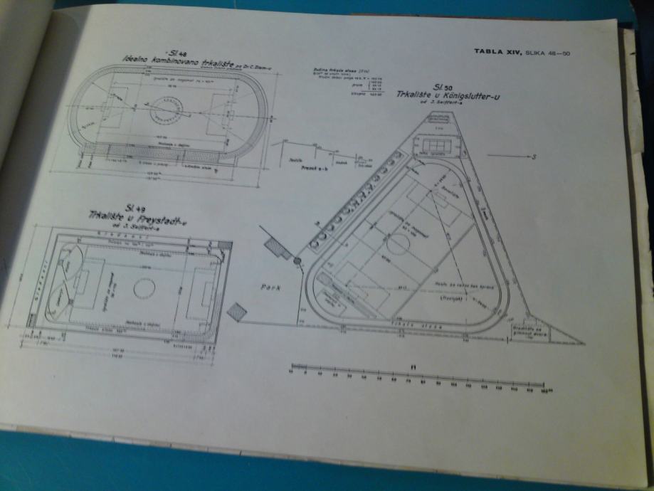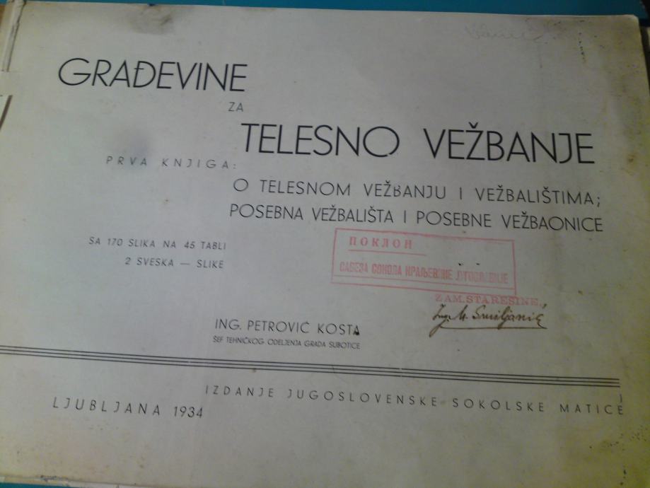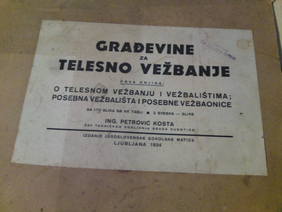 Građevine za tjelesno vježbanje, prva knjiga: O tjelesnom vježbanju i vježbalištima: posebna vježbališta i posebne vježbaonice, sa 170 slika na 45 tabli, napisao: ing. petrović Kosta, izdanje Jugoslavenske sokolske matice, Ljubljana 1934.g., , sa žigom - poklon saveza sokola kraljevine jugoslavije, sa velikim brojem stranica, koje opisuju sportske terene svih sportova.