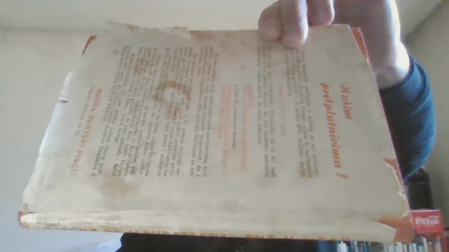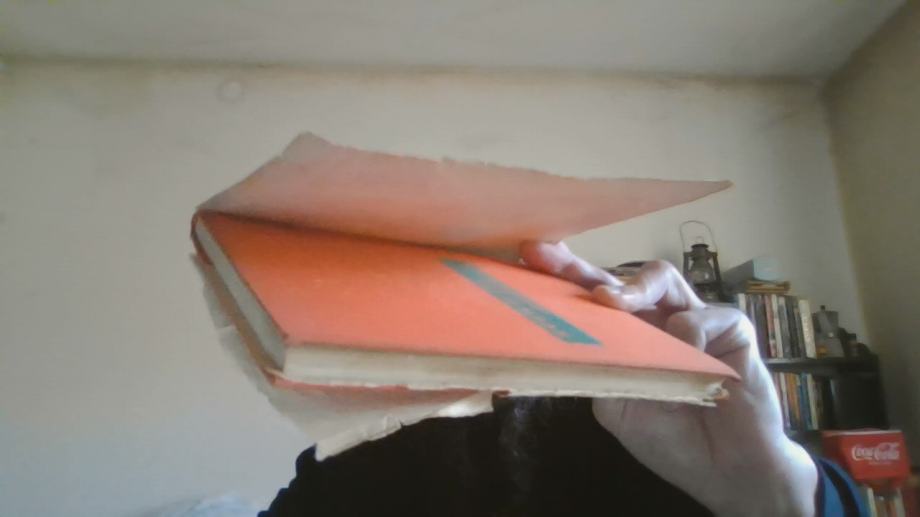 LOŠIJE STANJE (VANJSKI OMOT IMA JAKO PUNO OŠTEĆENJA I MRLJA I DIO OMOTA NEDOSTAJE, KORICE IMAJU NEŠTO MRLJA I OŠTEĆENJA, MRLJE PRI RUBOVIMA STRANICA I UNUTAR KNJIGE, NEKOLIKO NATPISA NALIVPEROM UNUTAR KNJIGE, OSTACI NALJEPNICE UNUTAR KNJIGE, NEKOLIKO STRANICA IMAJU PREGIBE, UGLOVI PAR STRANICA IMAJU MANJA OŠTEĆENJA, GORNJI DIO KNJIGE JE NAMOČIO PA SU VIDLJIVE MRLJE OD VLAGE I STRANICE SU MALO NAMREŠKANE)
