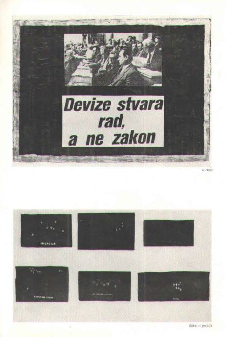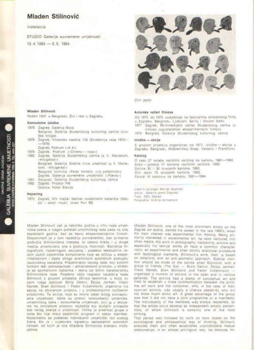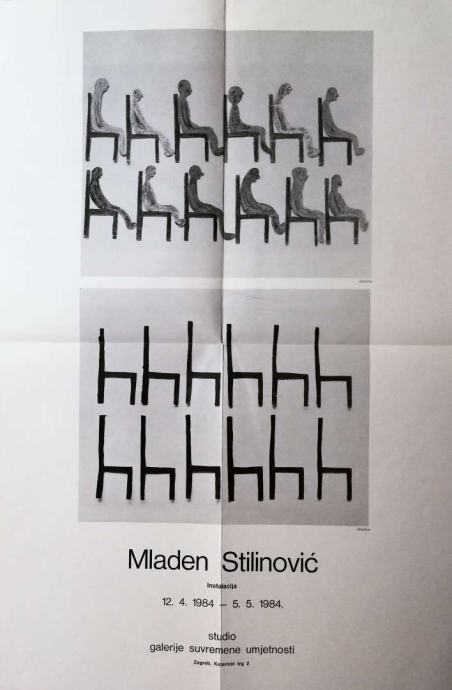 Plakat, deplijan s tekstom Mladena Lučića i Mladena Stilinovića na hrvatskom i engleskom jeziku s prikazom djela: Stolice, O radu, Parole, Slike-groblja.