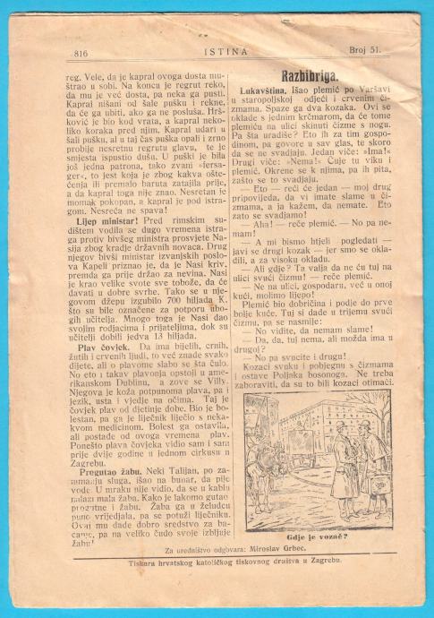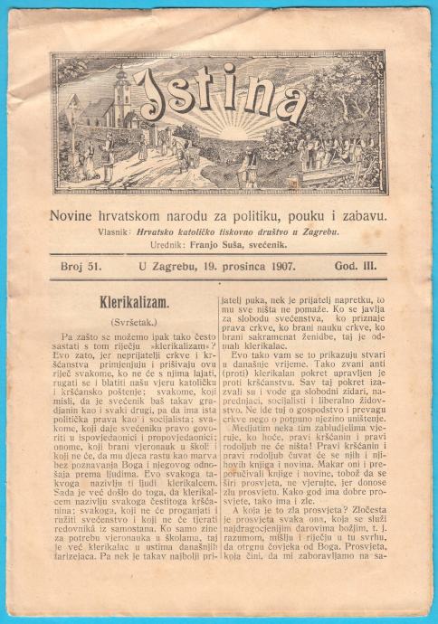 ISTINA - Novine Hrvatskom narodu za politiku, pouku i zabavu ... broj 51. od 19. prosinca 1907. godine.