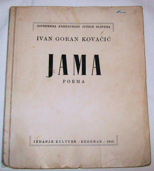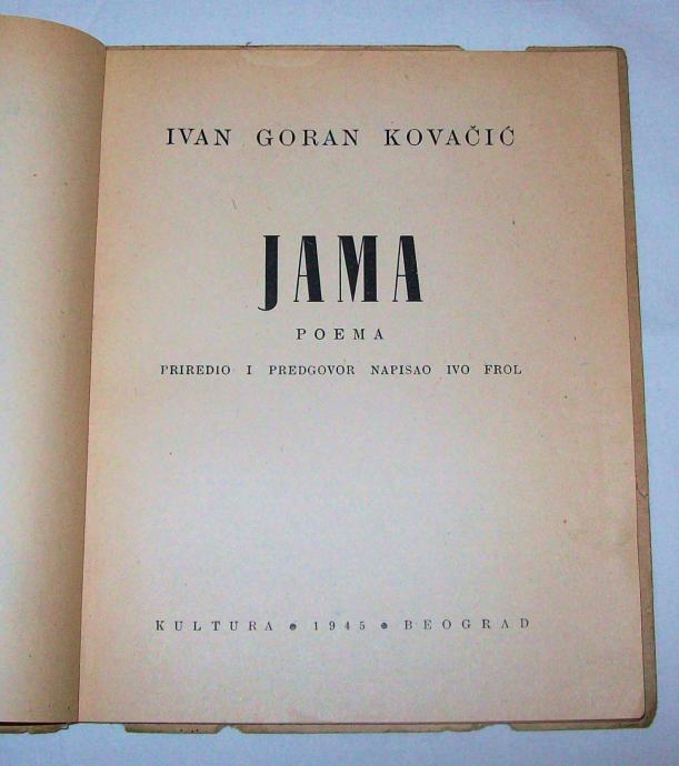Ivan Goran Kovačić (Lukovdol, 1913.- okolica Foče, 1943). Pjesnik, pripovjedač, esejist i kritičar. Bio je novinar i urednik kulture u više časopisa. Kovačić se 1942. S Vladimirom Nazorom pridružio partizanskom pokretu što je imalo velikog odjeka i u N.D.H. i među partizanima. Ubijen od četnika i ne zna mu se za grob. Jama, antiratna poema je prvi puta objavljena 1944. u Bariju, Italija. Jama, izdanje Kulture iz Beograda iz 1945. Priredio i predgovor napisao Ivo Frol.