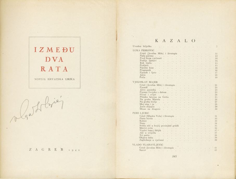 Između dva rata Novija hrvatska lirika 1942 Potpis Vlado Vlaisavljević