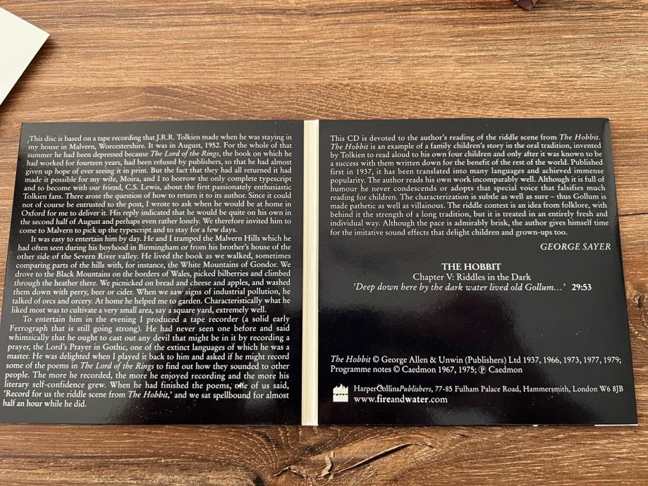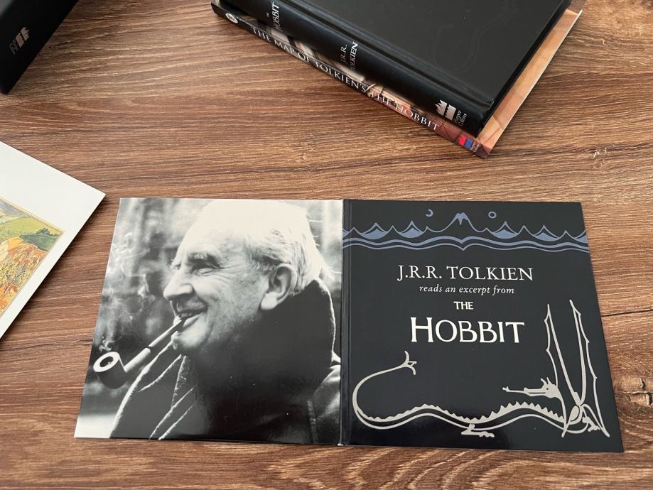 - nikad ranije objavljeni CD arhivske snimke na kojoj JRR Tolkien čita peti ulomak “Riddles in the dark” iz knjige. Snimka je nastala za vrijeme Tolkienovog boravka u kući svojeg prijatelja 1952. godine. Cijelo to ljeto je bio depresivan nakon što je izdavač odbio objaviti njegovu knjigu koju je pisao 14 godina (Lord of the Rings), te je na prijedlog prijatelja odlučio snimiti sebe dok čita omiljeni dio iz knjige, kako bi čuo kako to zvuči ostalim ljudima.