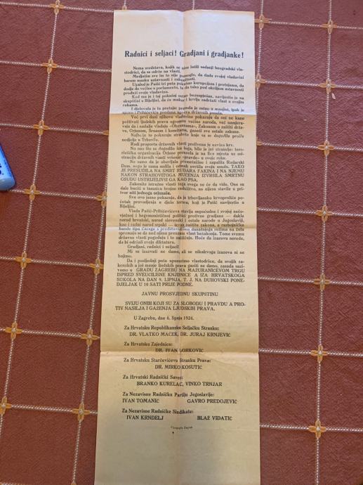 Prodajem letak povodom javne prosvjedne skupštine zbog smrti rudara fakina 1924... dimenzije 47.5/15 cm ( plaćanje na račun ili gotovina)