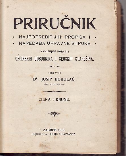 JOSIP HOHOLAČ : PRIRUČNIK NAJPOTREBNIJIH PROPISA I NAREDABA UPRAVNE STRUKE