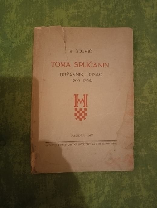 Prodajem knjigu K.Šegvića, Toma Splićanin,državnik i pisac 1200-1268, Zagreb 1927, stanje vidljivo na slici. Placanje na racun ili gotovina.