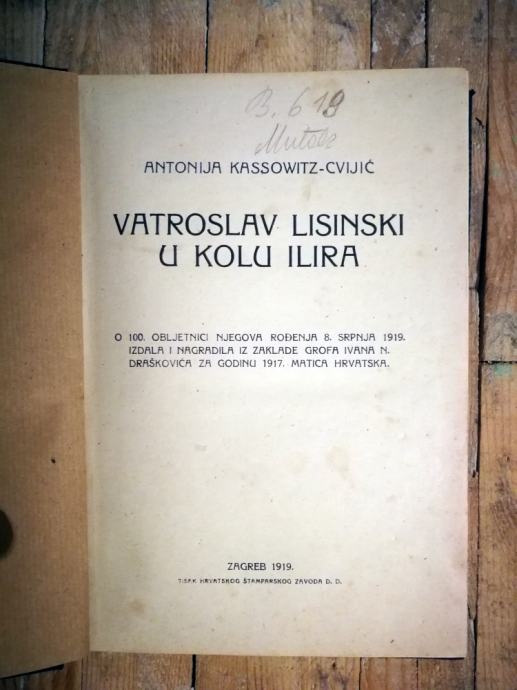 Kassowitz-Cvijić, Antonija - Vatroslav Lisinski u kolu Ilira : o 100. obljetnici njegova rođenja 8. srpnja 1919. izdala i nagradila iz Zaklade Grofa Ivana N. Draškovića za godinu 1917. Matica hrvatska