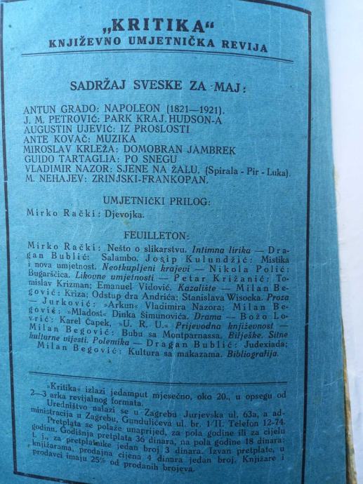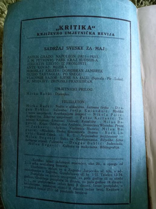Časopis - Kritika umetnicka revija iz 1921. godine. U pitanju je časopis broj 5, mesec maj. U odličnom je stanju.