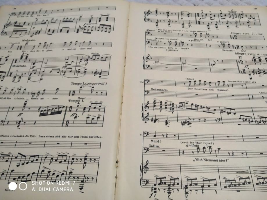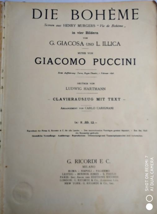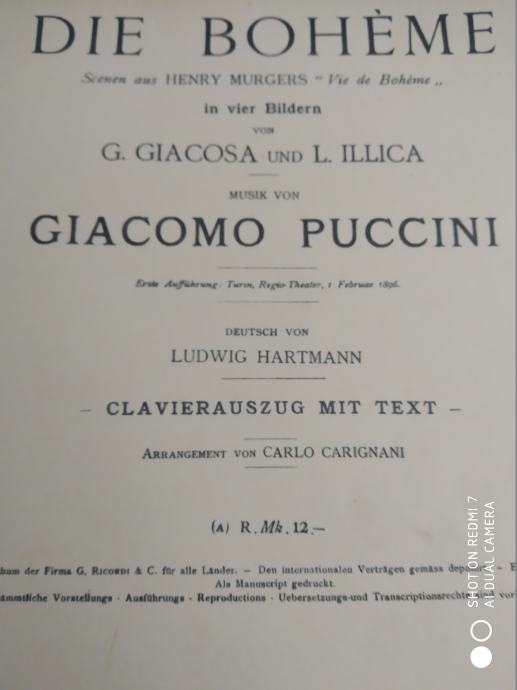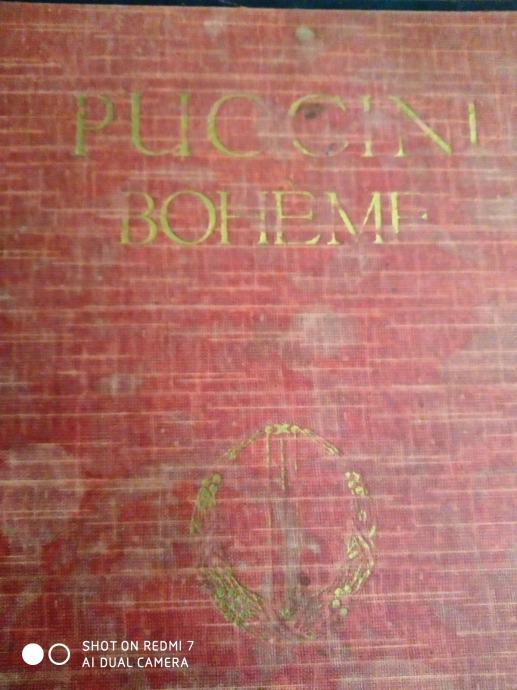 Prodajem "La Boheme", libretto, opera, note za klavir, njemačko izdanje, tvrdi uvez,.266 stranica, žig izdavača. Knjiga ima posvetu iz 1931.godine. Knjiga je dobro očuvana i kompletna samo fali hrbat. Cijena je 25 €.Po želji moguće slanje poštom ili Tiskom.