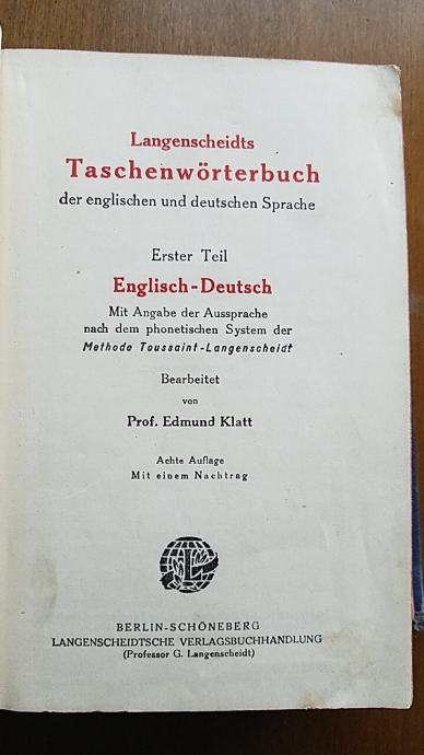 LANGENSCHEIDTS TASCHENWÖRTERBUCH ENGLISCH-DEUTSCH + DEUTSCH-ENG. 1929.