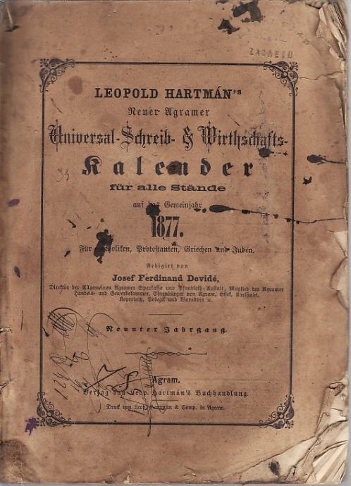 LEOPOLD HARTMANS NEUER AGRAMER KALENDER FUR ...1877 . AGRAM