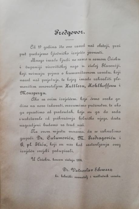 Predgovor: zahvala osnivačima zavoda dr. Vatroslava Schwarza, ravnatelja bolnice.
