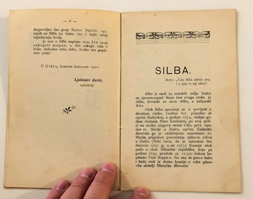 Silba je otok 29 morskih milja Zadru na sjevero-zapad. Staro ime ovoga otoka je Selbo, hrvatski se zove Silba, a talijanski Selve. Otok Silba spominje se u povijesti u devetom vijeku. Godine 827. pripadao je općini Zadarskoj, a godine 1073., zadnje godine vladanja Petra Krešimira, po svoj prilici na molbu njegove sestre Cike, prve opatice sv. Marije u Zadru, općina Zadarska darovala ga je ondašnjemu samostanu sv. Marije u Zadru. (Neki hoće, da je samostan bio darovan 1027. godine, a ne 1073.) Kasnije otok pade u vlast Mletačke republike, koja ga godine 1639. prodade za 12.350 dukata kapetanu Frani Soppe-u. Ne zna se pravo kako i kada otok je došao kasnije u ruke glasovite obitelji Mletačke Morosini.