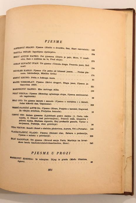 PJESME: Frano ALfirević, Pear Bakula, Natko Antun Brkić, Ivan Goran Kovačić, Karlo Hausler, Kruno Krstić, Vjekoslav Majer, Ranko Marinkoivć, Nikola Polić, Oto Šolc, Ante Tresić Pavičić, Tin Ujević, Viktor Vida, Vlado Vlaisavljević, Radovan Žilić. Pjesme u prozi: Zdenka Marković, DRAME: Rasim Filipović. NOVELE: Iso Cipelić, Ivan Goran Kovačić, Vjekosalv Kaleb, Vjekosal vMajer, Mirko Maksimoivć, Isak Samokovlija, Novak Simić, Verka Škurla Ilijić. POUKA: Ivan Bulić, Jerko Jurin, Frano Kesterčanek, Vikot Kučinić, Ivo Ladika, Ante Petravić, Milan Selakoivć, Branko Šicel, Stanisalv Šimić, Rudolf Zaplata