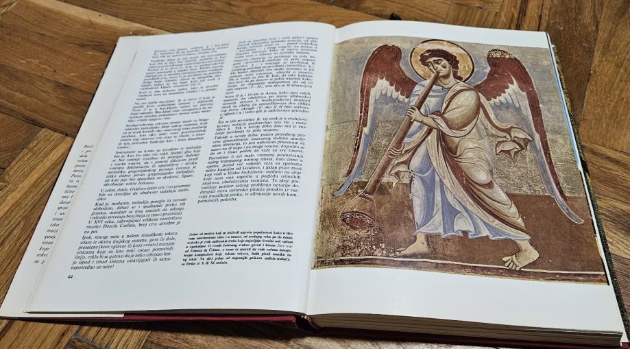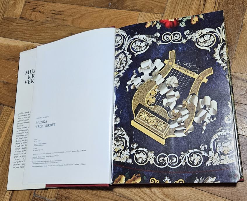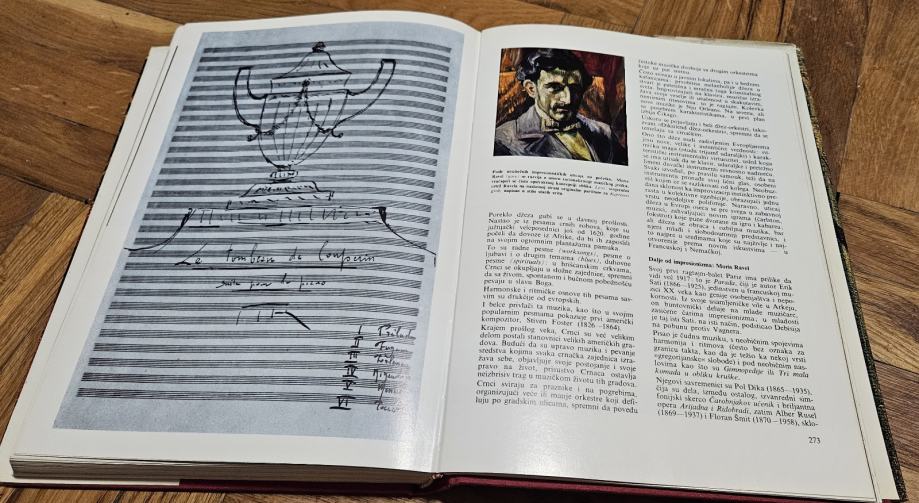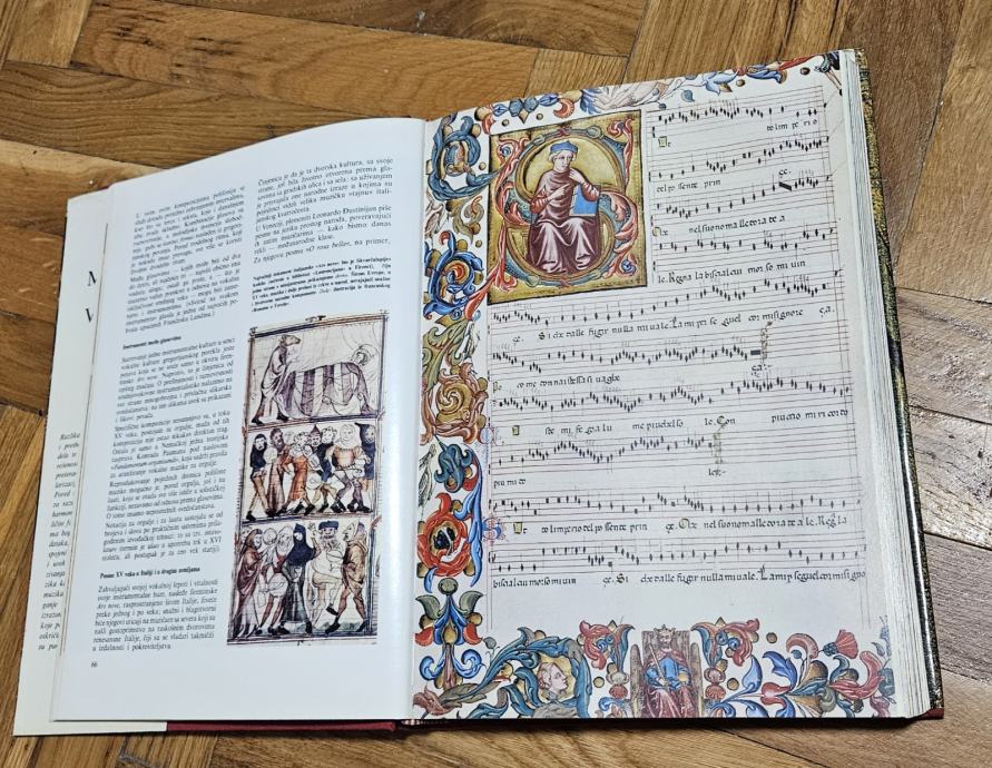 Antikvarno izdanje koje prikazuje razvoj glazbe od antike do 20. stoljeća – stilovi, skladatelji, instrumenti i kulturni kontekst.