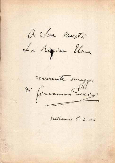 U knjizi je Puccinijeva posveta kraljici Jeleni Savojskoj (Regina Elena).