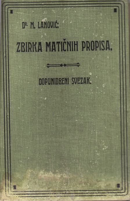 MIHAJLO LANOVIĆ - ZBIRKA MATIČNIH PROPISA , ZAGREB 1913. TVRDI UVEZ 248 STR...………...150 KUNA