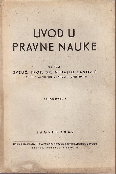 Mihajlo LANOVIĆ: - Uvod u pravne nauke , ZAGREB 1942 , 435 DTR. MEKI UVEZ...………………...50 KUNA