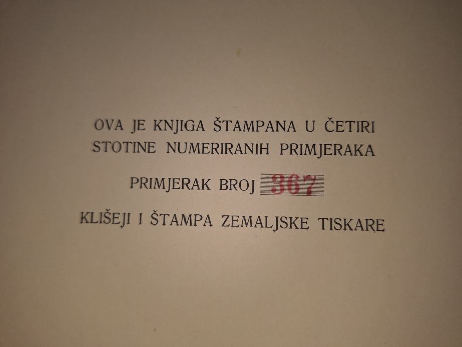 Naklada 400, numerirani primjerak 367/400. Sadrži 47 autotipija, 7 fototipija, 3 kromolitografije i 2 izvorna drvoreza.