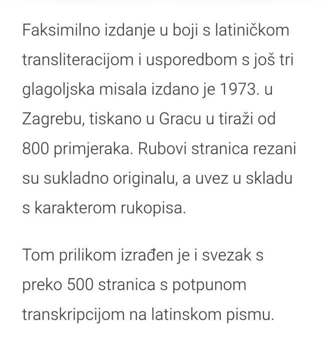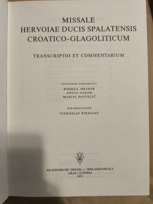 Prodajem Missale Hervoiae Ducis Spalatensis Croatico-Glagoliticum iz 1973. godine. Radi se o izdanju u dva sveska – faksimil i transkripcija s komentarom (Transcriptio et Commentarium). Knjige su tvrdih korica u bordo crvenoj boji s pozlatom na hrptu.