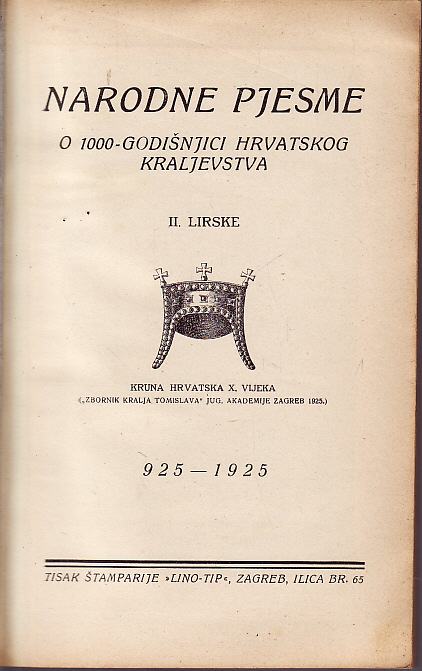 Narodne pjesme o 1000. godišnjici kraljevstva hrvatskog 925-1925. 1-2.