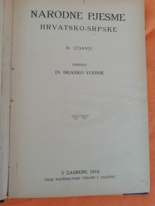 Narodne pjesme hrvatsko- srpske priredio Branko Vodnik 1918.g.