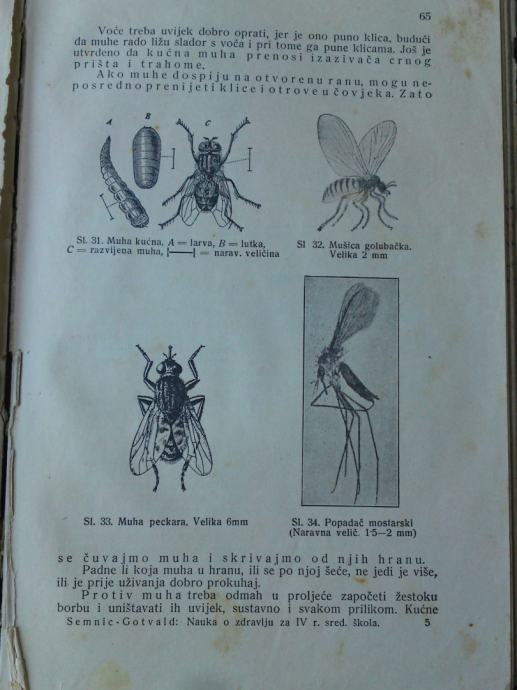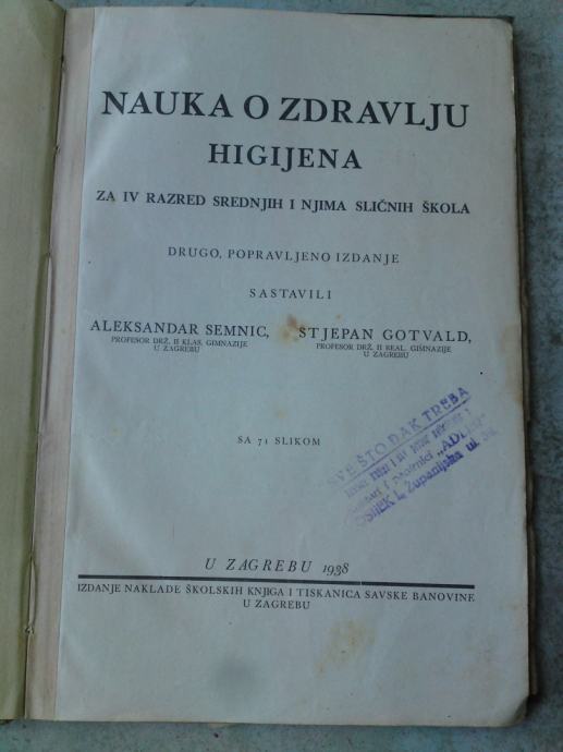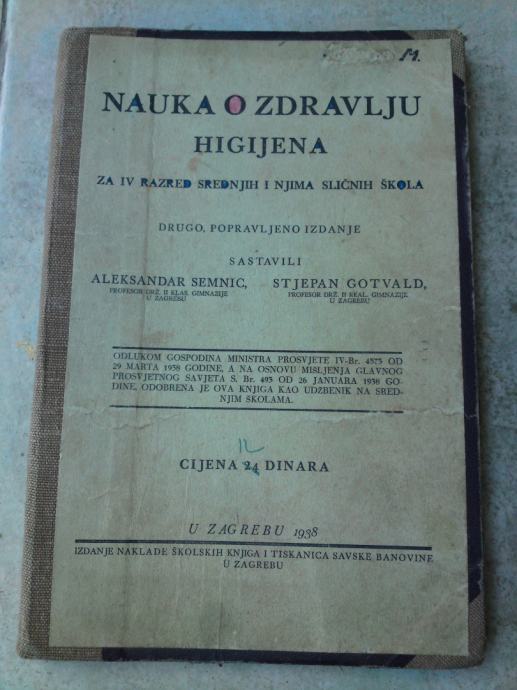 Nauka o zdravlju - higijena; udžbenik za srednje škole iz 1938.g.; sastavili: Aleksandar semnić, stjepan Gotvald, odlukom ministra prosvjete ova knjiga je odobrena kao udžbenik na srednjim školama; tisak: štamparski zavod Krvavac i pavlović u Osijeku; Izdavač. izdanje Naklade školskih knjiga i tiskanica Savske Banovine u Zagrebu; broj stranica: 128;