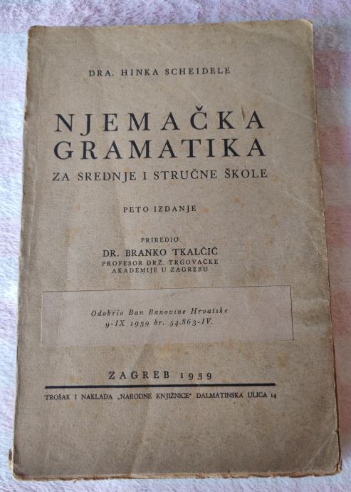 Knjiga Njemačka gramatika autora Dra. Hinka Scheidele iz 1939. u izdanju Narodne Knjižnice, Zagreb.