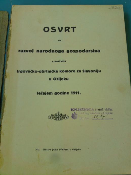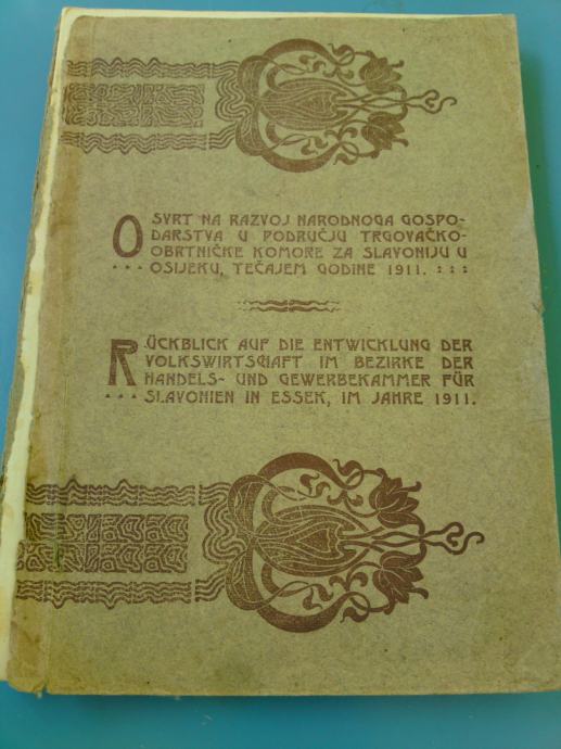 Osvrt na razvoj narodnog gospodarstva u području trgovačko-obrtničke komore za Slavoniju tečajem godine 1911., tiskara Julija pfeiffera u Osijeku, 1912.g., tvrde korice, latinica, dvojezično: hrvatski-njemački, 183 str. , stanje. odlično.