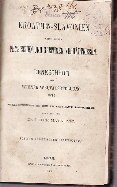 MATKOVIĆ, Petar Kroatien-Slavonien nach seinen physischen und geistigen Verhaltnissen : Denkschrift zur Wiener Weltausstellung 1873.