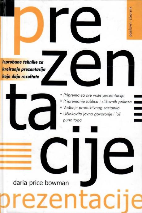 Knjiga Prezentacije vam nudi alate potrebne za kreiranje uspješnih prezentacija, od prijedloga do planova i motivacijskih govora. Ova knjiga nudi postupne upute za razvijanje i izlaganje savršene prezentacije, uključujući i upute o tome kako: