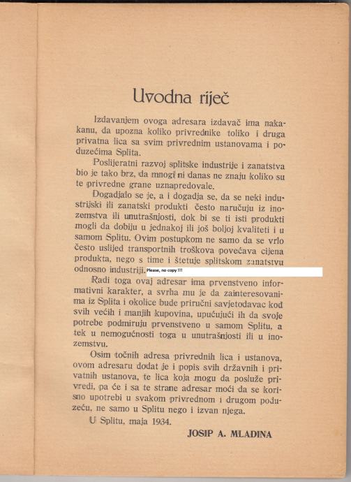 PRIVREDNI ADRESAR SPLITA (1934) J. Mladina * Svi obrtnici i firme Spli