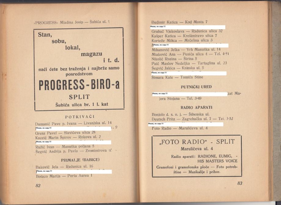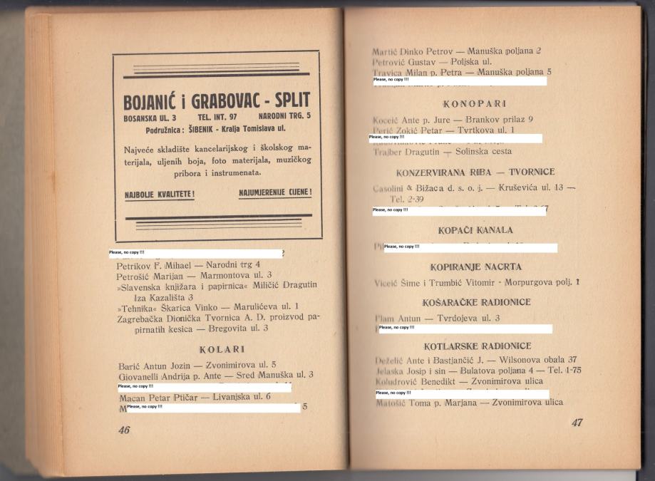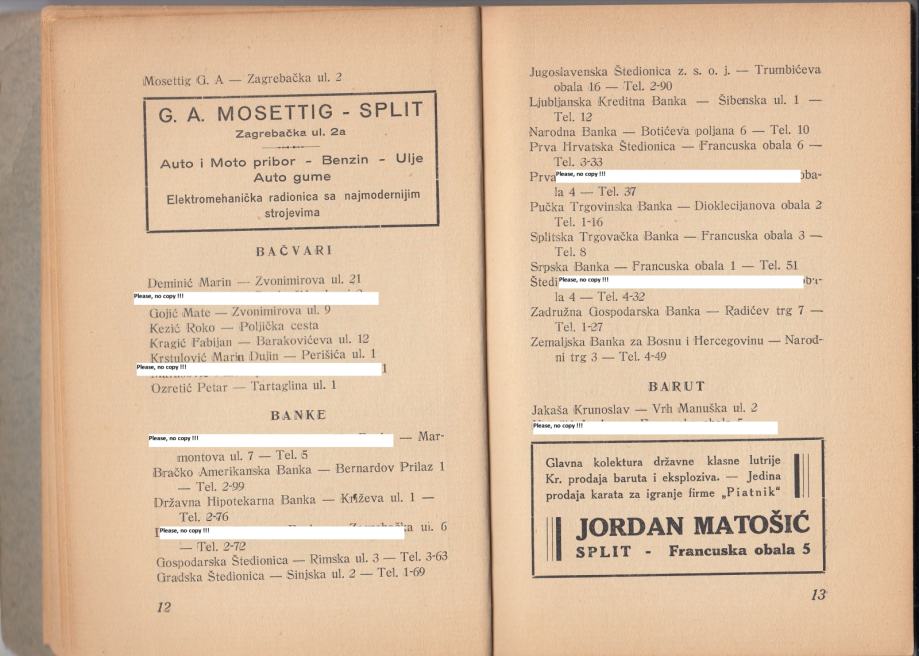 Jako zanimljiva i rijetka stara knjiga sa spiskom svih poduzetnika, obrtnika, zanatlija ... Splita iz 1934. godine (kopači kanala, potkivači, primalje, košaračke radionice, kolari, brusači, bačvari, pituri, jaja, keramičari, kišobrani-suncobrani, inžinjeri i arhitekti, hoteli svratišta restauracije, gostionice, frizerski saloni ...
