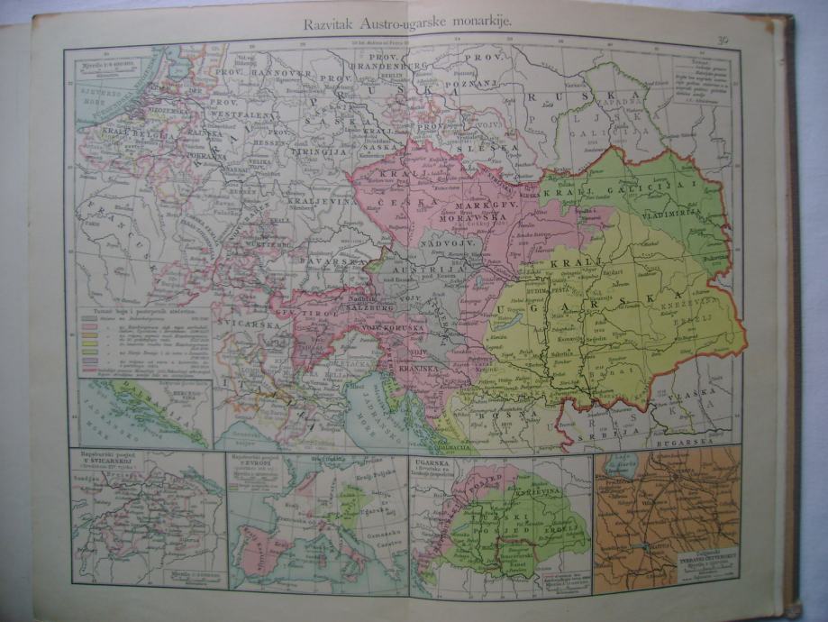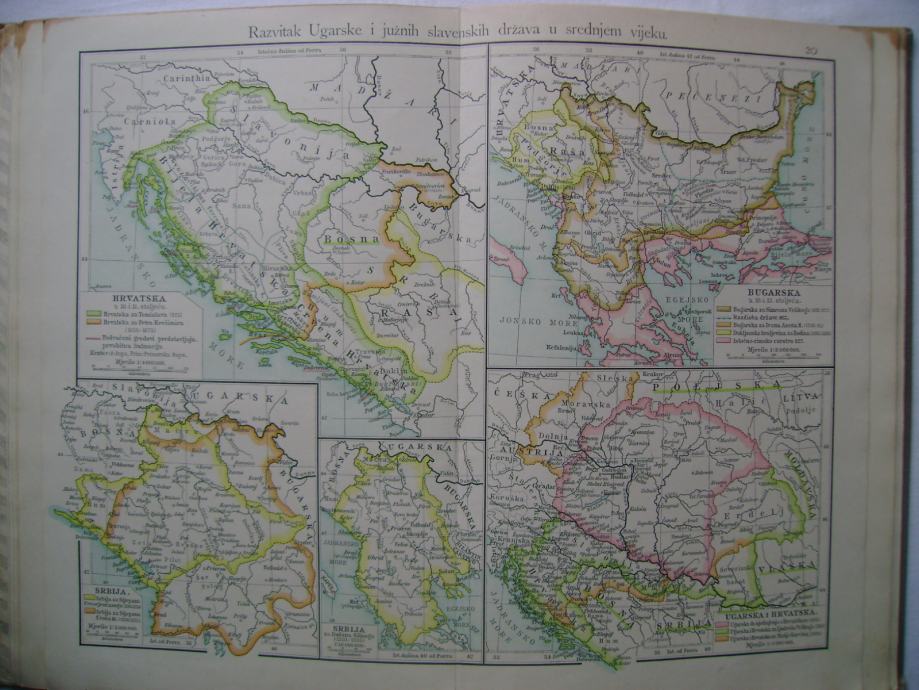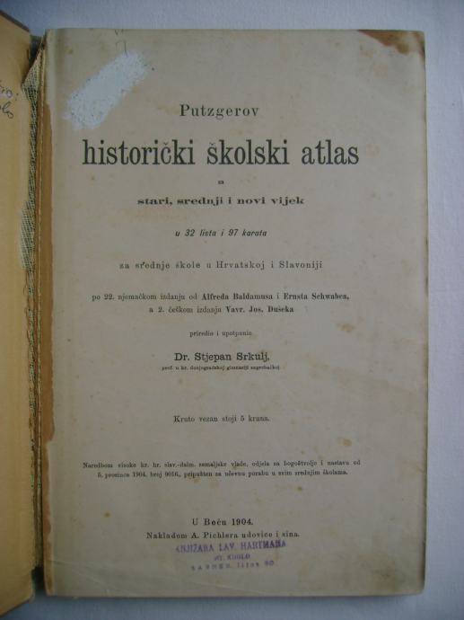 Putzgerov historički školski atlas za stari, srednji i novi vijek u 32 lista i 97 karata za srednje škole u Hrvatskoj i Slavoniji - priredio i Stjepan Srkulj, izdavač Naklada A. Pichlera udovice i sina, Beč 1904. godine, 18 x 26 cm, tvrdi uvez.