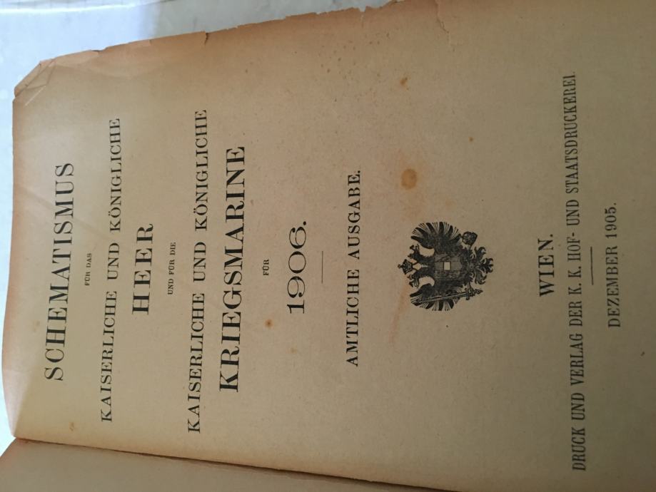 Schematismus fuer das Kaiserliche und Koenigliche Heer und fuer die Kaiserliche und Koenigliche Kriegamarine fuer 1906. Amtliche Ausgabe Wien.1905. Knijga je kompletna, ima 1556 stranica, ima originalni plan (Militaerterritorial-und Regaenzungsbezirkseinteilung) u boji u odličnom stanju.