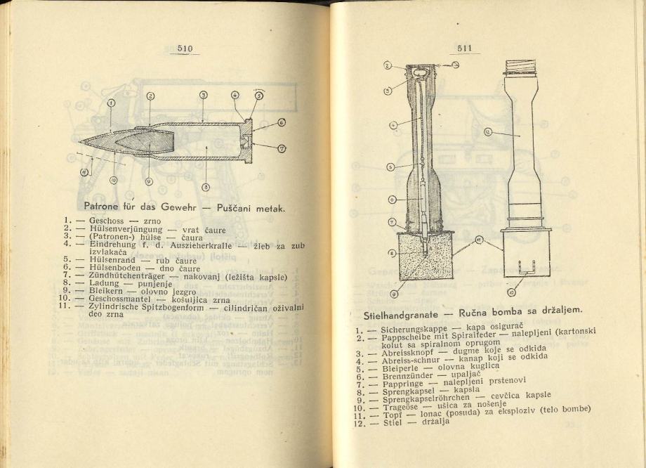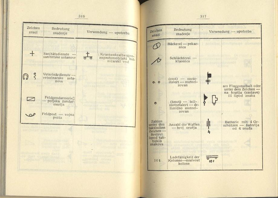 Nemačko-srpskohrvatski vojni rečnik, Deutsch-serbokroatisches Militärwörterbuch. Serbokroatisch-deutsches Militärwörterbuch. Wehrmachtova vojna publikacija koja je prevedena i objavljena 1940. u Beogradu kao Nemačko-srpskohrvatski vojni rečnik. Vojska Kraljevine Jugoslavije je tu publikaciju koristila kao pomoćnu za izradu vlastitog znakovlja. Prikazani su simboli pojedinih vrsta oružja odnosno simboli Wehrmachtovih postrojbi prije Drugog svjetskog rata.