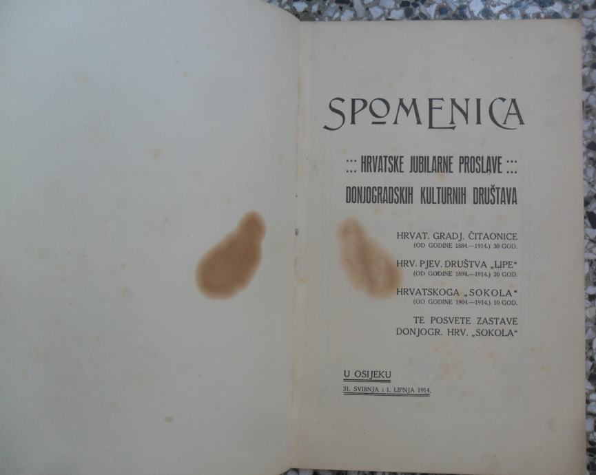 Spomenica hrvatske jubilarne proslave donjogradskih kulturnih društava Hrvat, gradj. čitaonice (od godine 1884.—1914.) 30 god., Hrv. pjev. društva „Lipe" (od god. 1894.—1914.) 20 god., Hrvatskoga „Sokola" (od god. 1904.—1914.) 10 god. te posvete zastave donjograd. hrv. „Sokola".