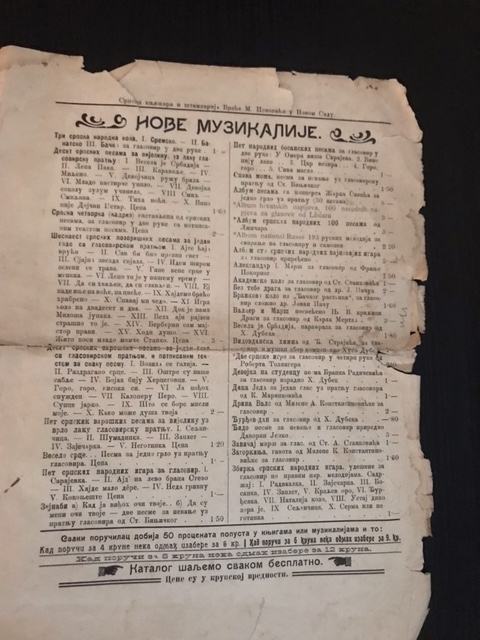Stari oglas,za glasovir i dve ruke u lakom slogu složio Isidor Bajić.Sa kontra strane ponuda "Nove Muzikalije"knjižare i štamparije Brače M.Popoviča u Novom Sadu.Godina nepoznata.