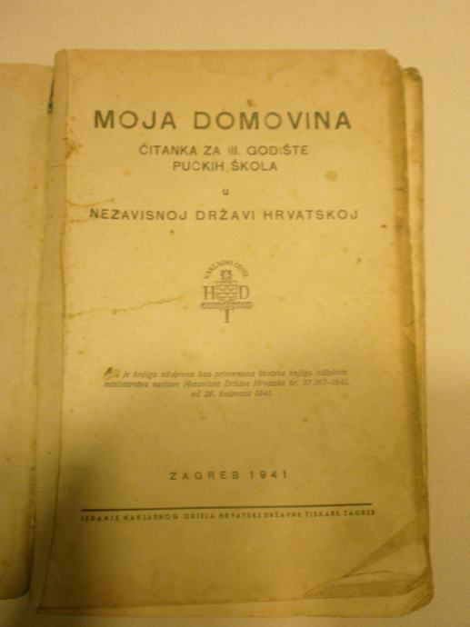 Vrijedna knjiga – Moja domovina - Čitanka za III. godište pučkih škola u Nezavisnoj Državi Hrvatskoj, izdanje Nakladnog odjela Hrvatske državne tiskare (1941. g., 233 str.). Šaljem poštom, Tiskom ili osobno preuzimanje.