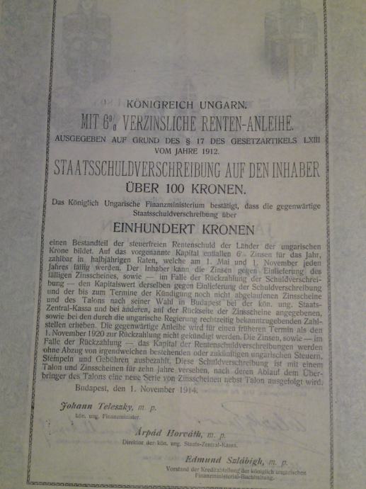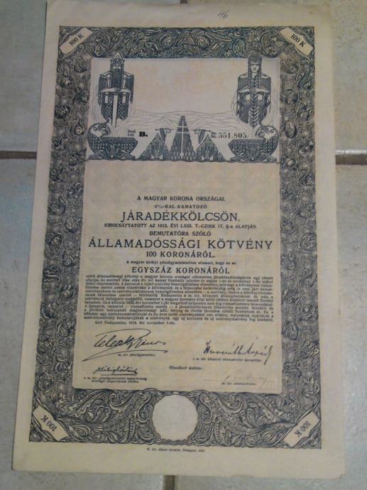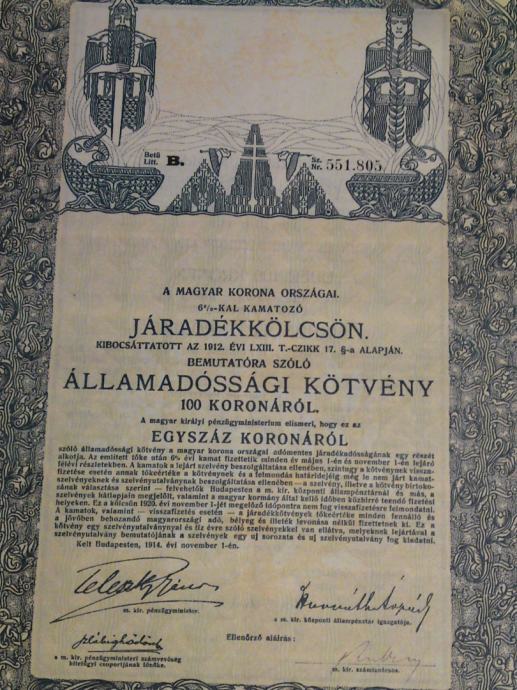 Stara mađarska državna obveznica iz 1912.g., 100 korona., broj 551.805 na mađarskom i njemačkom jeziku.