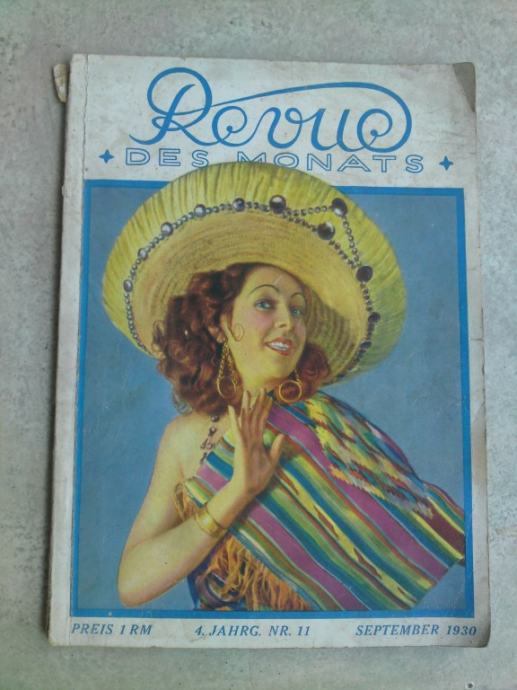 Stari i očuvani mjesečni časopis Revue na njemačkom iz 1930.g; koji se tiskao u Berlinu, broj 11, cca. 100 stranica, pisan na njemačkom jeziku ilustriran s mnogo crno-bijelih fotografija, posebno lijepih žena i golog ženskog tijela, koje je za ono vrijeme bila tabu tema. Obrađuje teme iz sexa, automobilizma,... te zanimljivih tabu tema .Približna veličina 7 x 9 inča (18 x 23 cm).