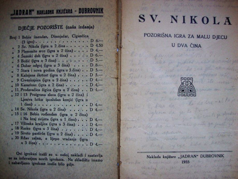 SV.NIKOLA Pozorišna igra za malu djecu u dva čina - 1935. DUBROVNIK