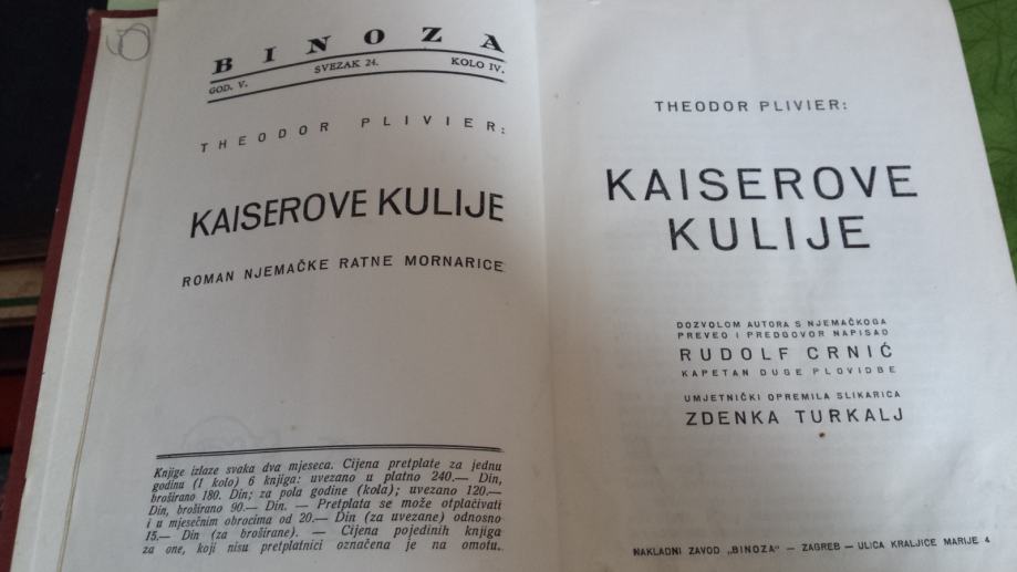 Kaiserove Kulije (Roman Njemačke ratne mornarice), Theodor Plivier. Izdanje nakladnog zavoda Binoza – Zagreb, (1938). Tvrd uvez, 305 stranica. očuvano