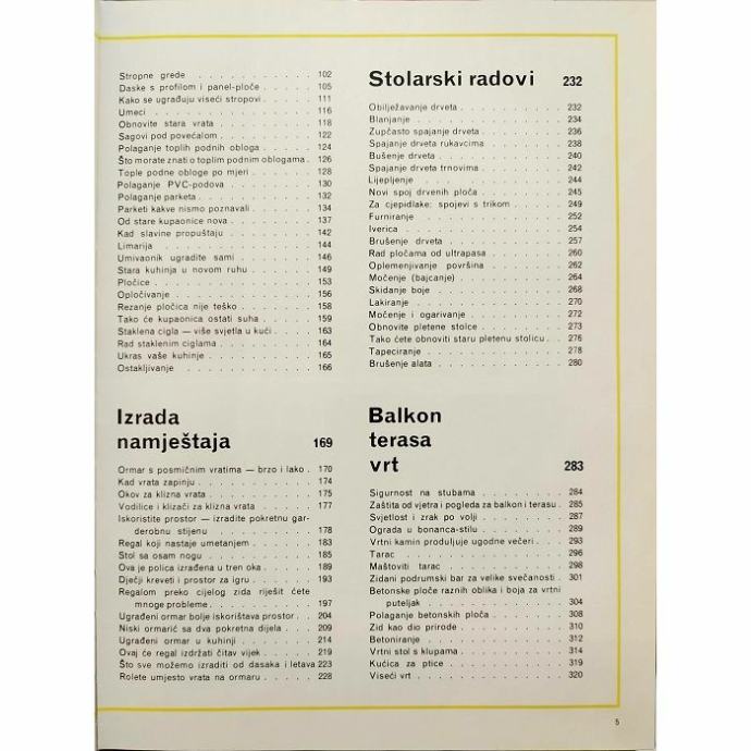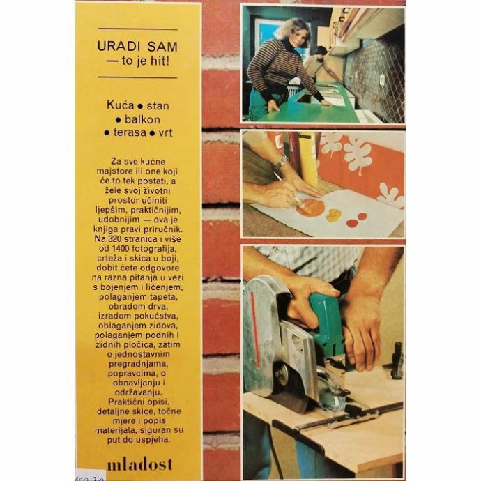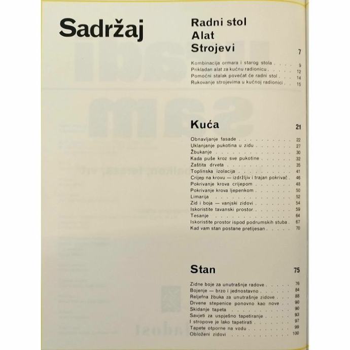 Za sve kućne majstore ili one koji će to tek postati, a žele svoj životni prostor učiniti ljepšim, praktičnijim, udobnijim ova je knjiga pravi priručnik. Na 320 stranica i više od 1400 fotografija, crteža i skica u boji, dobit ćete odgovore na razna pitanja u vezi s bojenjem i ličenjem, polaganjem tapeta, obradom drva, izradom pokućstva, oblaganjem zidova, polaganjem podnih i zidnih pločica, zatim o jednostavnim pregradnjama, popravcima, o obnavljanju i održavanju.