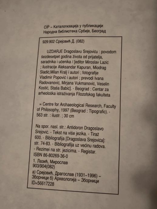 Uzdarje Dragoslavu Srejovicu, povodom sezdesetpet godina zivota od prijatelja, saradnika i ucenika, Univerzitet u Beogradu, Centar za arheoloska istrazivanja Filozofskog fakulteta, 1997.g.